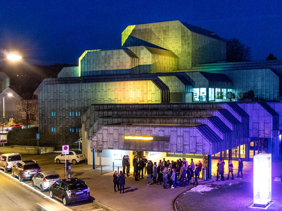 Das Theater Winterthur, 1979 vom Architekten Frank Krayenbühl fertiggestellt, ist ein äusserst eigenwilliges und damit schweizweit – wenn nicht international – einzigartiges Haus. Diese Eigenständigkeit fusst auf der Verbindung sehr differenter architektonischer Prinzipien. Das Äussere zeichnet sich durch eine in der Höhen- und Tiefenentwicklung gestufte und aufgrund der weitgehend geschlossenen, unverkennbaren Bleiplattenverkleidung monolithisch wirkende Volumengliederung aus. Im Bericht der kantonalen Denkmalpflege wird diese Volumetrie richtigerweise dem postmodernen Strukturalismus zugeordnet. Gleichzeitig erzeugt die äussere Erscheinung aber auch weitere Assoziationen. Man fühlt sich etwa an die abstrakten, zuweilen mimetisch anmutenden «Berg- oder Fels-Kompositionen» des späten Alvar Aalto erinnert.
